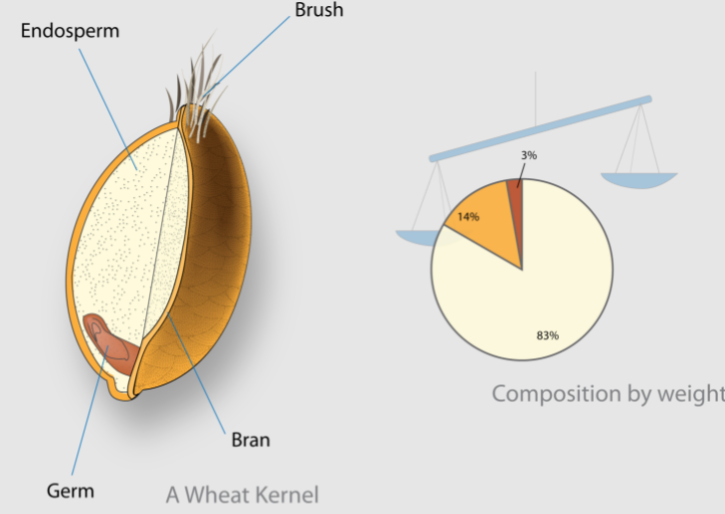 Below image and table shows anatomy of the wheat grain and particulars about atta (whole-wheat flour) and maida (refined flour).
